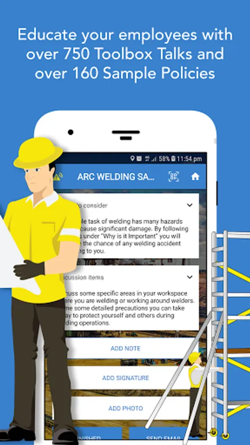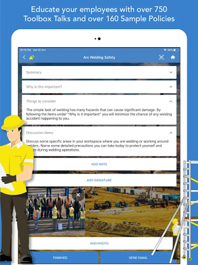 500+ Toolbox Talk Topics which can be modified by each company. Capture signatures from all participants- even take a picture of your team performing the talk. Email the toolbox talk (with your company logo) to third parties immediately. A toolbox talk creator also allows companies to create their own!