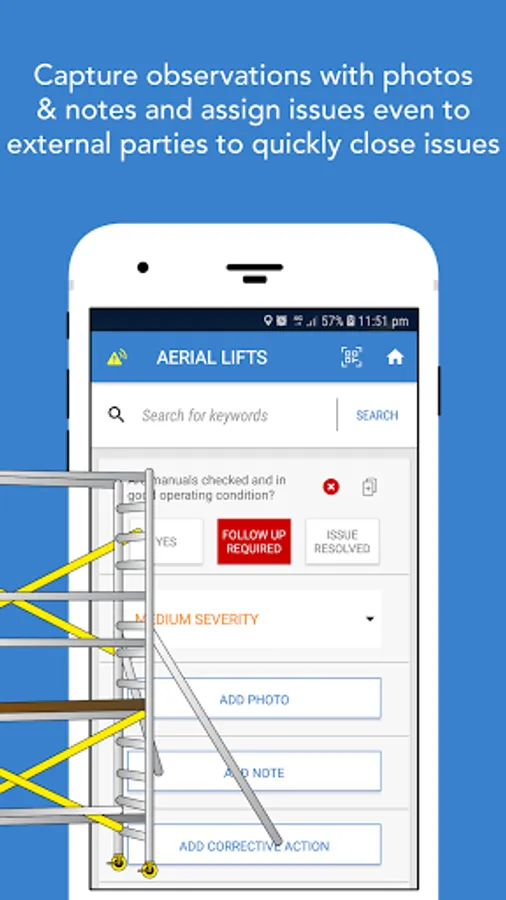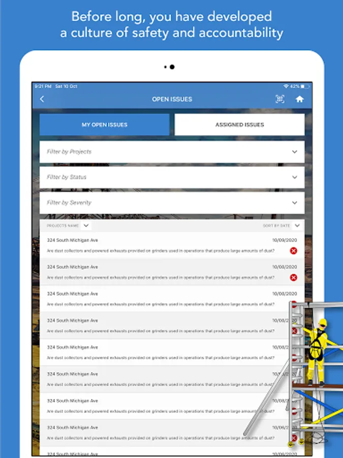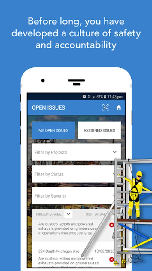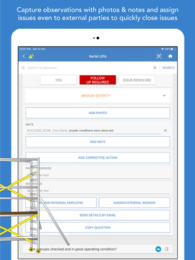 Each safety issue can be assigned to multiple internal and external vendors and contractors through the mobile app with push and banner notifications sent to each device. Each worker provides notes and photos of the issue for real-time collaboration to quickly close issues. Each observation can also be signed in the field for accountability.