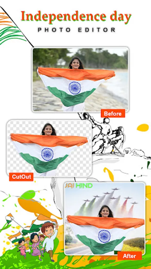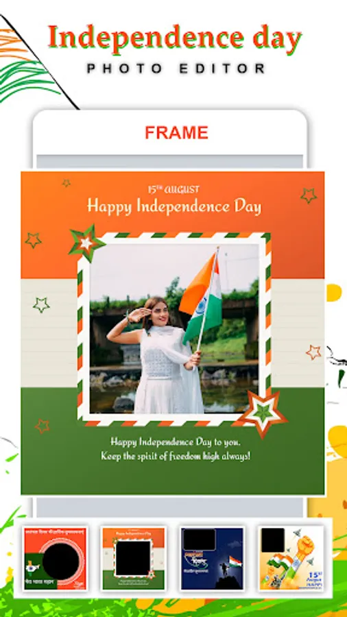 These 15 August frame app contains variety of 15 August backgrounds like Indian flags, Ashoka chakras, Indian army, Indian historic photos and etc, to give you the August 15th Photos backgrounds.