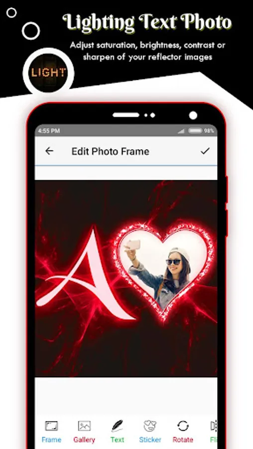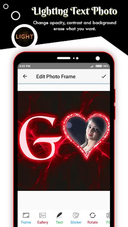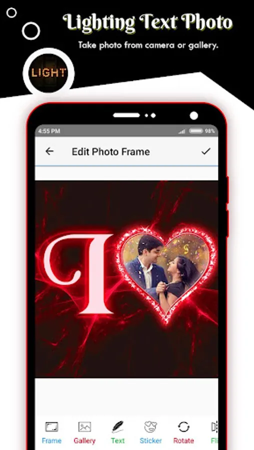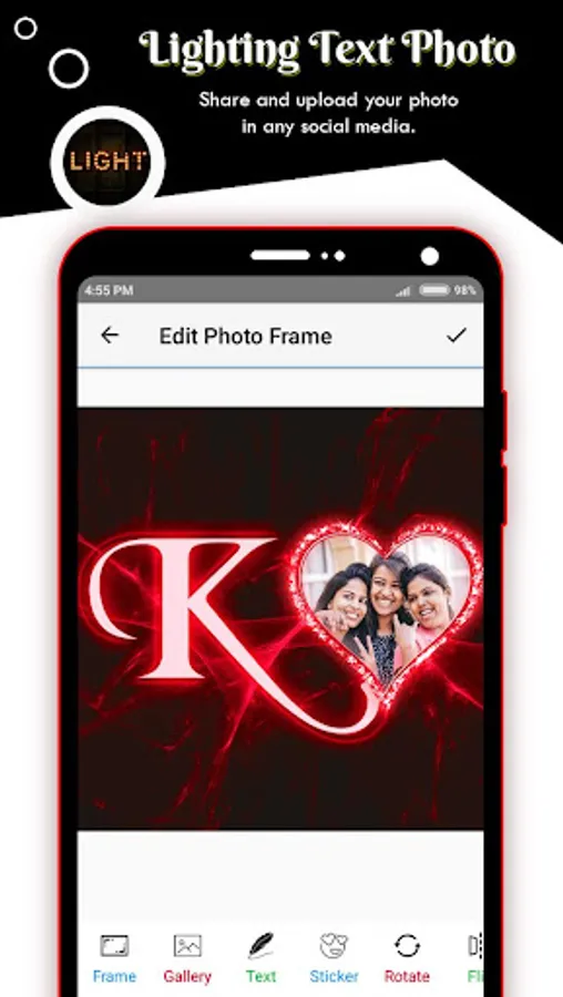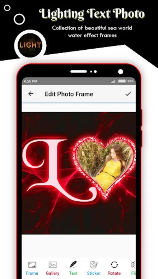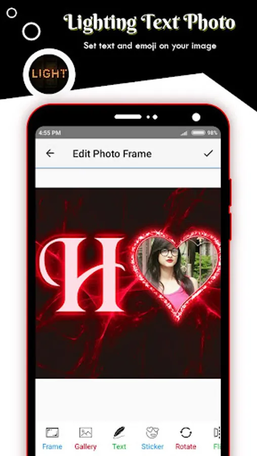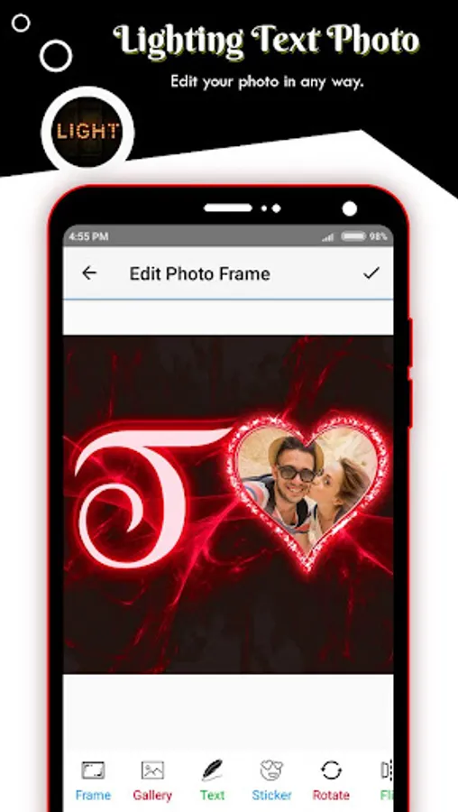 - Rotate, scale, zoom in, zoom out or drag the photo to fit the “Lighting Text Photo Frame" as you like!
