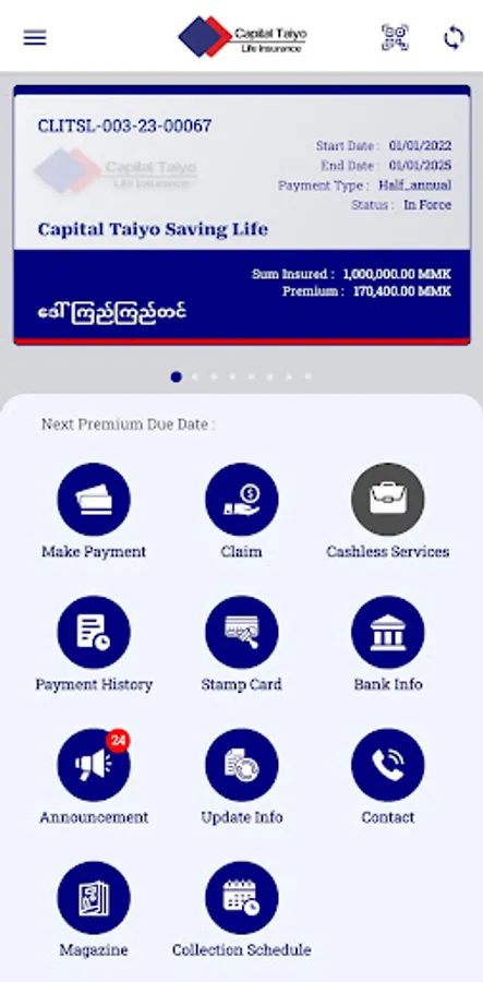 Our Capital Taiyo Life Insurance brings the awesome insurance app for our beloved customers. From now on, anytime anywhere, our customers can check the policy & premium payment information, claim the benefit & access the latest information.