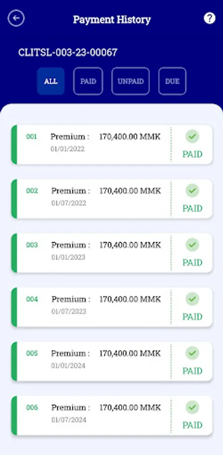 5. Keep in touch with latest payment information on premium payment history by Paid, Unpaid & Due categories.