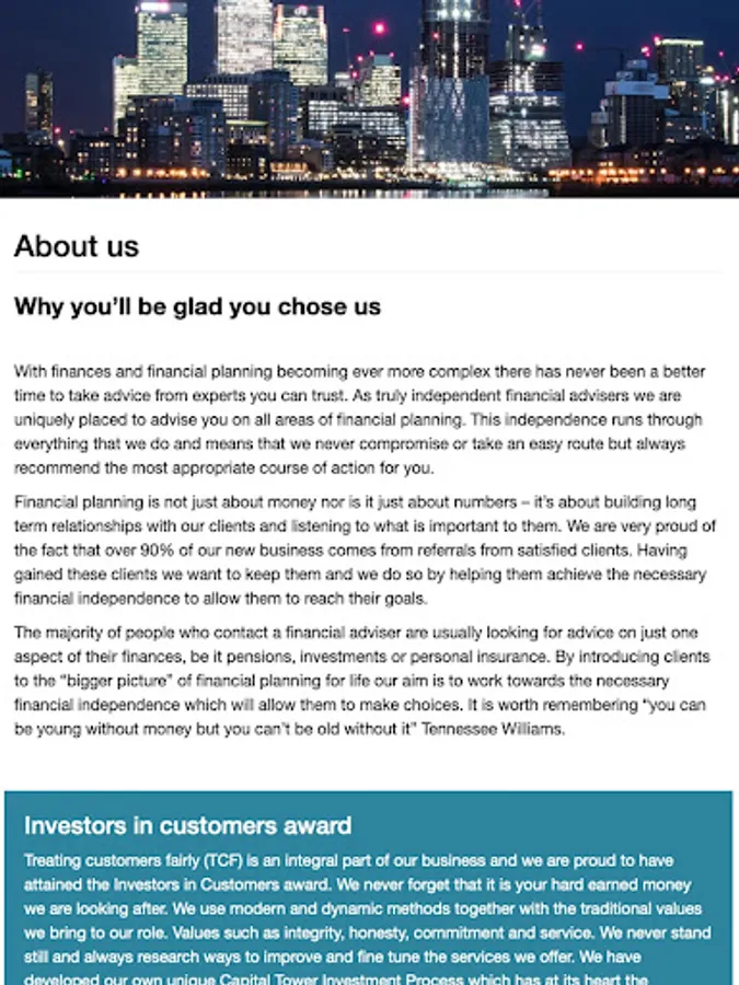 The Capital Tower app is a financial adviser application built for Capital Tower Ltd. The app features financial calculators, digital magazines and financial guides, updated news, tax tables and access to our client portal.