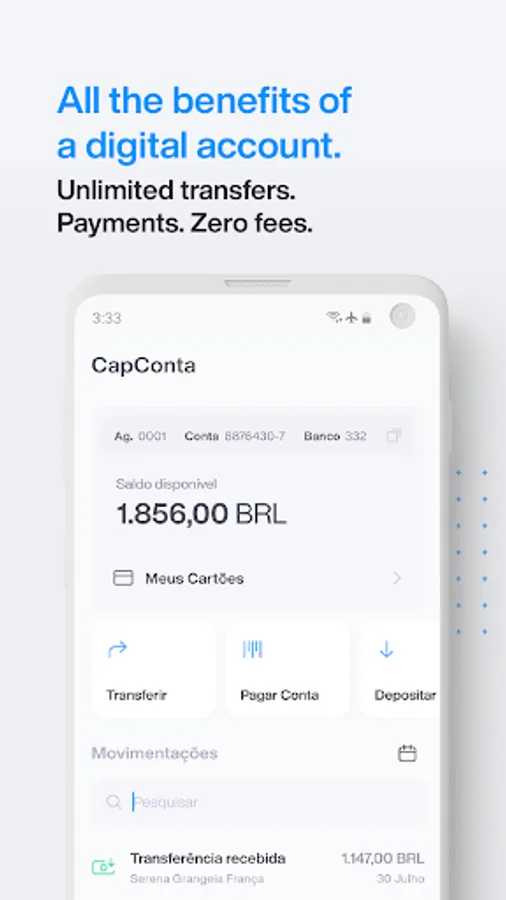 Enjoy banking services of a truly digital account with CapAccount. Unlimited transfers, guarantee of the Treasury Financial Bills (LFT), salary portability, zero fees. And it doesn't stop there!