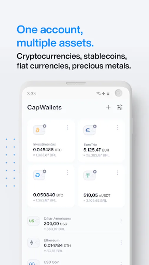 In a digital account: cryptocurrencies, stablecoins, fiat currencies and precious metals. Access a diverse portfolio of assets with CapWallets.