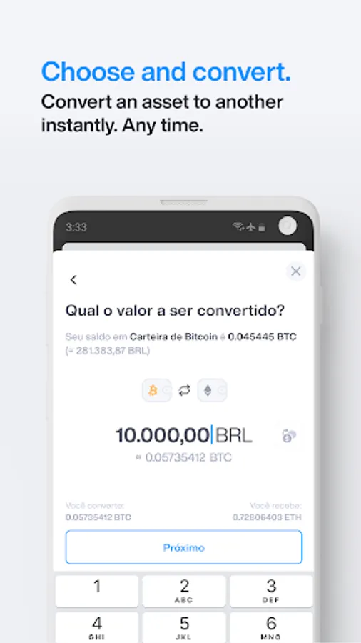 Anytime: Convert assets to each other instantly. Just choose the assets and values.