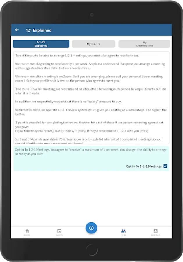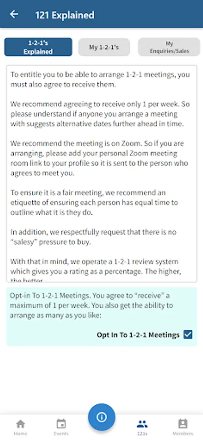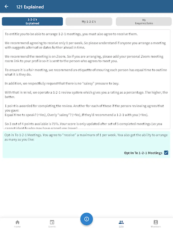 And pushy sales techniques are also discouraged. You anonymously rate each other on adherence to these guidelines to produce your 1-2-1 rating.
