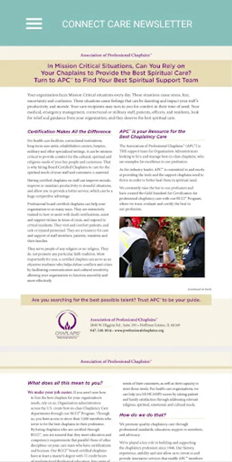 Enables employees at client companies of Marketplace Care Partners immediate and easy access to their assigned Care Partner Team. Users enter their Company ID# (provided by their HR department or Marketplace Representative) to gain access to interface with their chaplain team members via phone, text, and/or email. Additional ebooks, videos and other resources pertaining to a myriad of life issues are available by category for users to browse and use exclusively through Care Partner app. The information shared with team members via this app is strictly confidential unless there is a direct threat to a life, information about harming someone or if a law is being broken. Requires a consistent internet connection to work. Periodically an optional webinar may be scheduled by your company related to wellness, life issues, and other related topics. These webinars, as well as usage of the Employee Care Service, is not required by management but is simply being made available to all employees without expense.