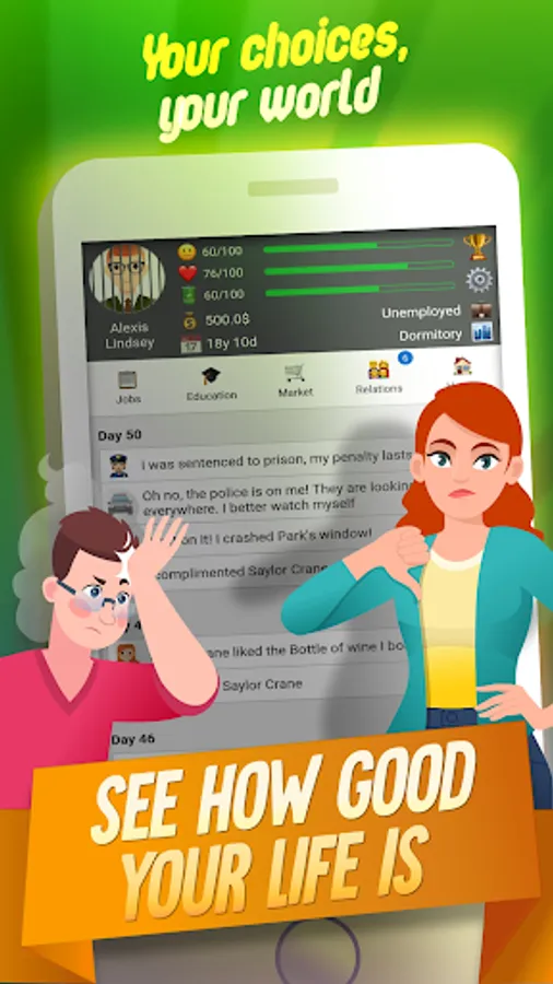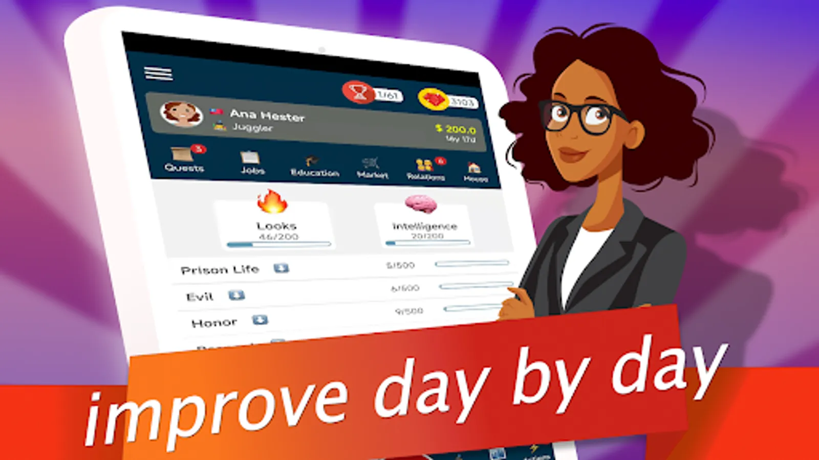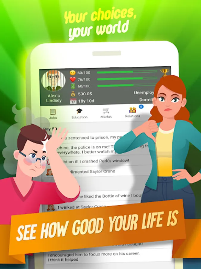 This RPG in real life allows you to pick a gender, name, face, and some basic customization. Then you can start playing the fun simulator life game at 16 years old. Follow the in-depth in-game tutorial and delight in the idle life sim top simulation game.