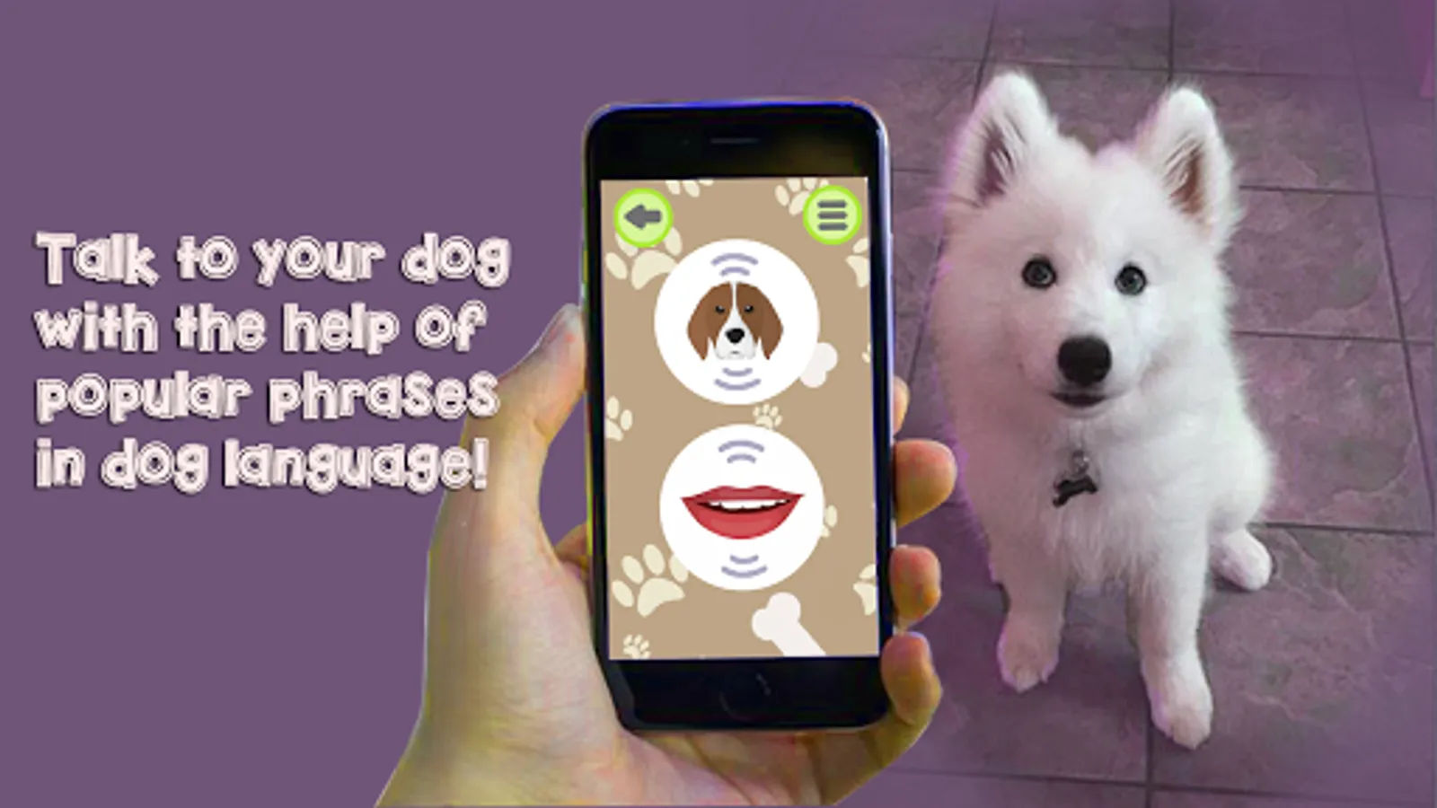 Have you ever wanted to talk to your dog? Say something important or just give it a command. This app might help with it. Choose among the most common phrases on canine language or translate your voice speech into doggy language and show it to your hound.
