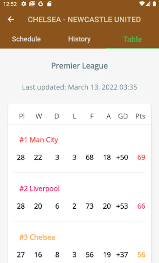 - Show detail of schedule: place, datetime, history of 2 teams, ranking of current table