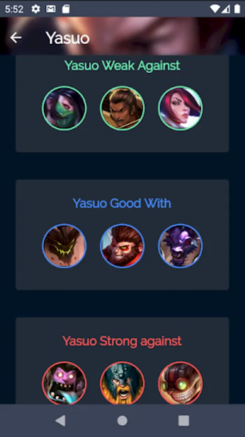 Easy to use, beautiful and elegant. Few animations and effects that you can turn off to improve performances. This app was built to grant you the best user experience. User easy to search anything such as champion, item, rune in apps. This apps is FREE, without ADs and small size to download.