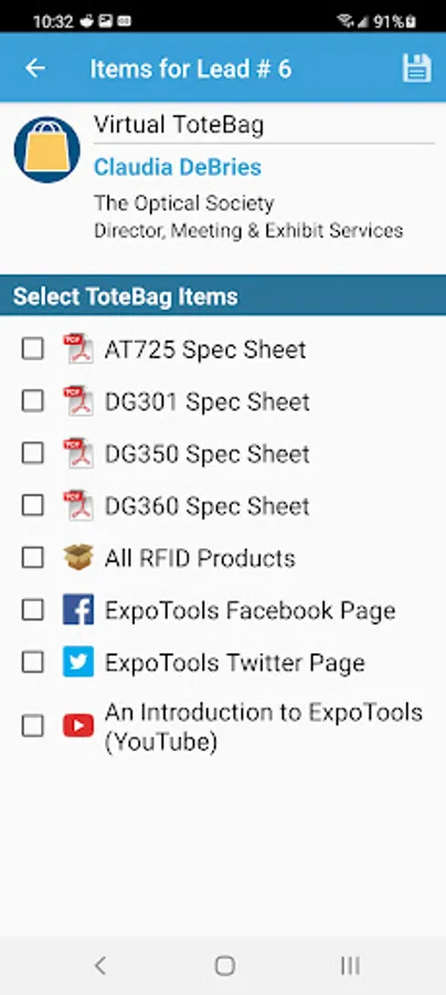 Take pictures of attendees and add items to their digital ‘tote bag’ for later follow-up. No more wasted brochures or printed materials!