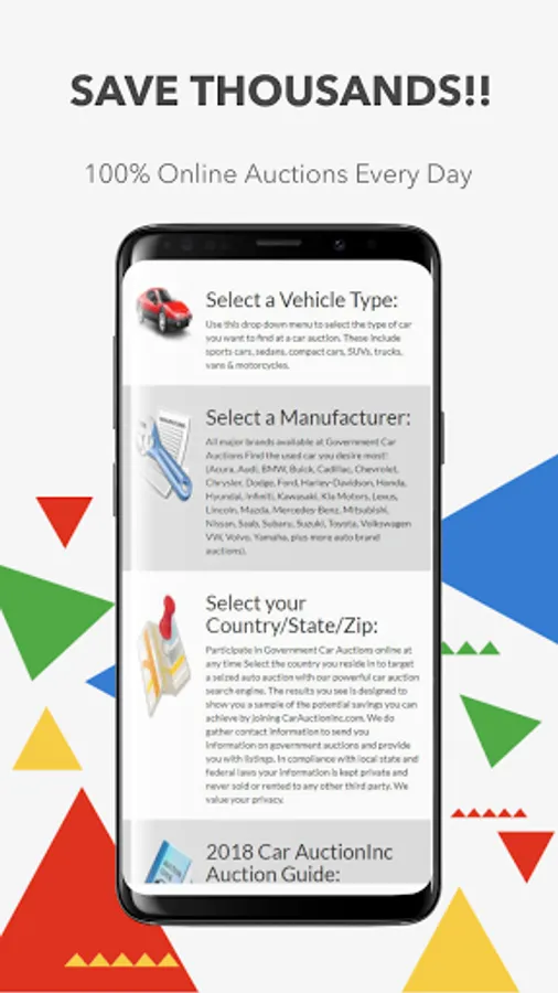 This is a convenient option to purchase cars from places like Cars.com or Auto Trader --- There are over hundreds of cars in one location. Auto auctions app is the best of it's kind. This auto auction app is better and easier than wasting time with local used car dealers or viewing a single car at a time at dealerships..