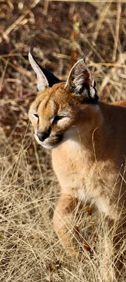 • Caracals characterised by a robust build, long legs, a short face, long tufted ears, and long canine teeth. Typically nocturnal, the caracal is highly secretive and difficult to observe. It is territorial, and lives mainly alone or in pairs. The caracal is a carnivore that typically preys upon birds, rodents, and other small mammals.