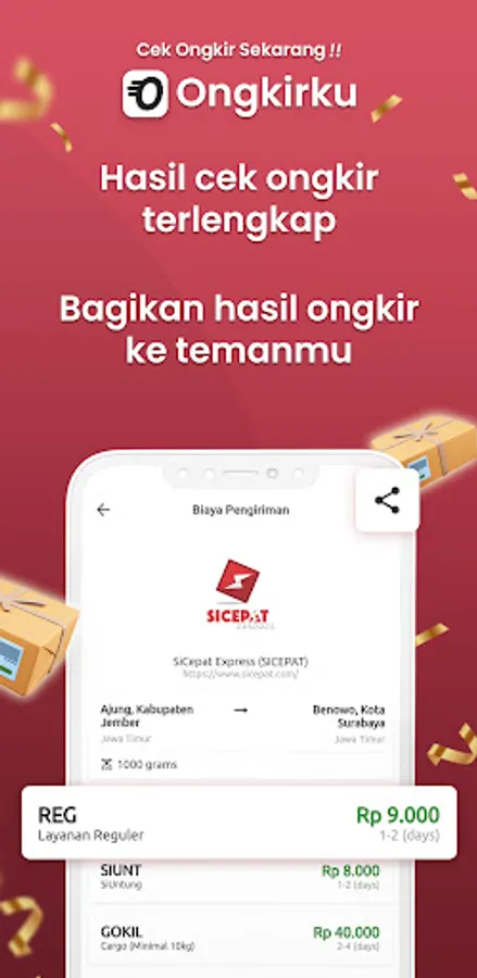 Ongkirku is elegantly and simply designed. Intended for those of you who want to find shipping prices quickly and easily. We will always provide the best user experience to be comfortable and practical.