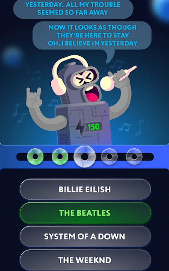 🤘 Everyone, kids, and adults will be delighted with our music quiz. As each song is performed by the charming vocal of the robot Maxim. It makes a new way of sounding even for the old, familiar songs. Due to the level's structure, the songs can be guessed pleasantly and easily. We have collected songs of different levels of complexity and carefully mixed up them. Can't guess who is a song maker? — Make brief pauses, it is enough to look at the answer options from a different angle or use a hint. Don't forget to share the app with your friends, it's easier to guess difficult songs together.