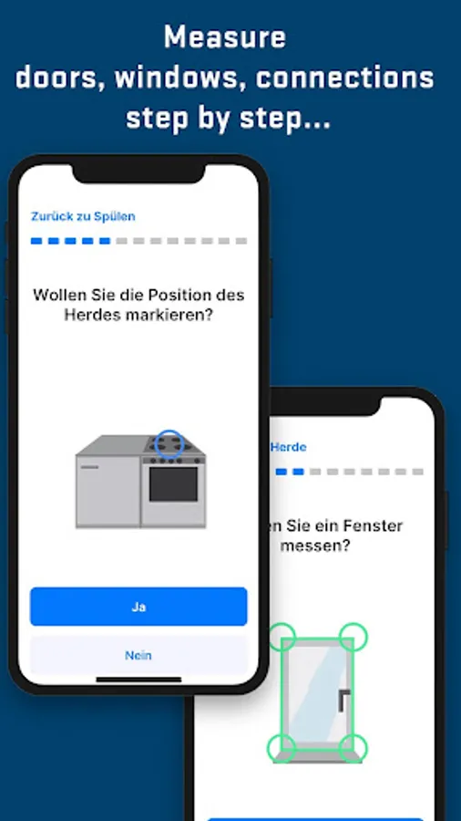 EasyRoom guides you step by step through the measuring procedure of the floor plan, doors and windows, connections and all further important elements. You can insert pictures and notes. In the end, you have collected all important information that a professional kitchen designer needs.