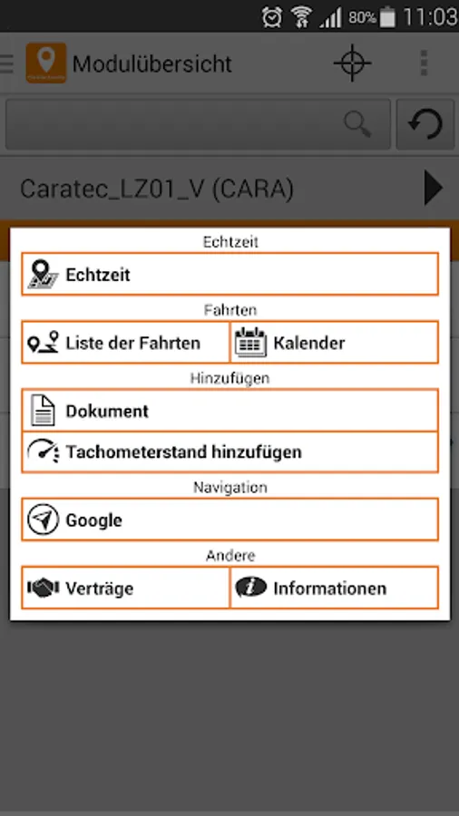 The car has an Caratec Electronics CET200T has GPS positioning system equipped and enabled the corresponding service to use the app. All information about the hardware and services is available online at http://gps.caratec.de.