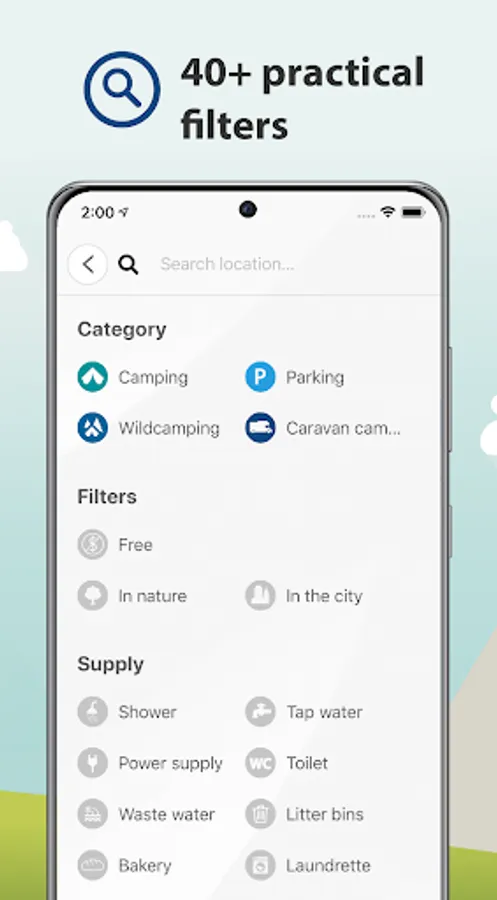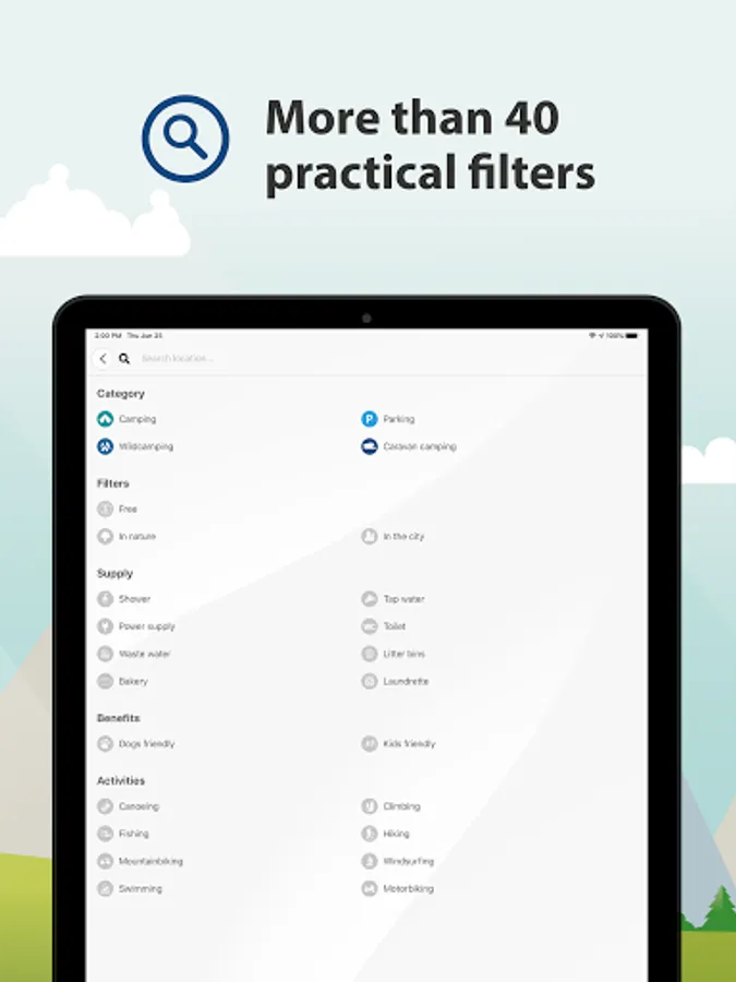 Even the best RV parks, most hidden pitches for dispersed camping, or most beautiful campsites are useless if you can't find them. With our practical filters, you decide what is important to you, whether it's the type of pitch, facilities, features, or activities.