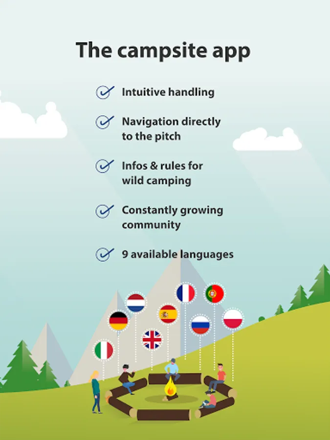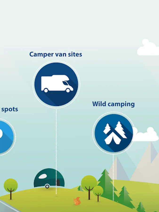 Campsites, pitches for dispersed camping, micro-campsites, RV parks, and parking lots, all with detailed information and photos - in nine different languages!
