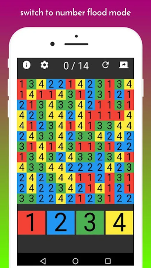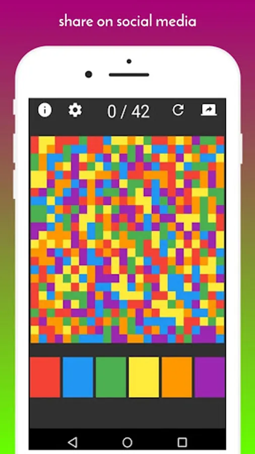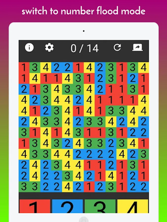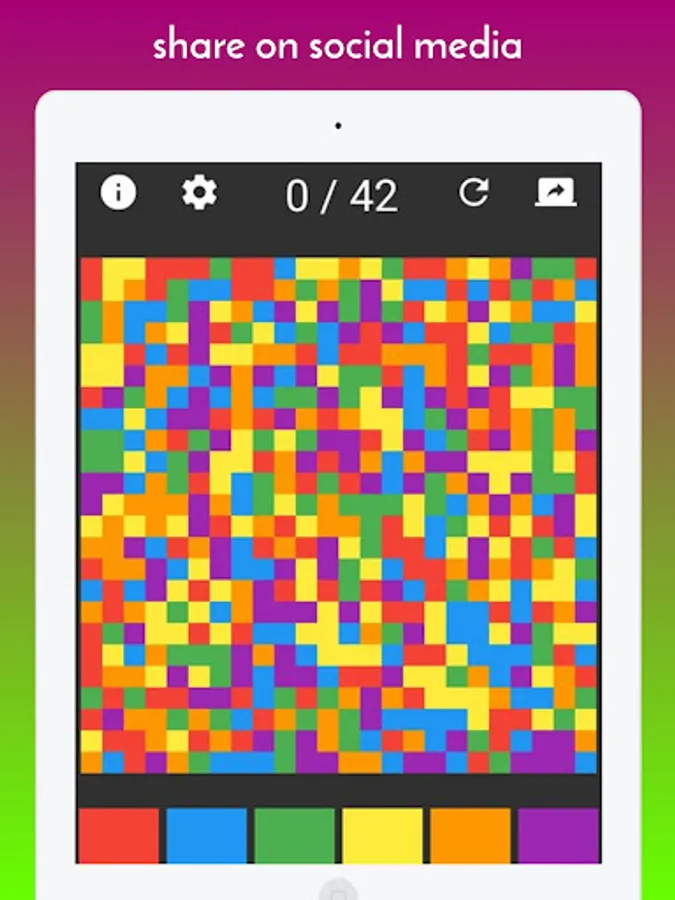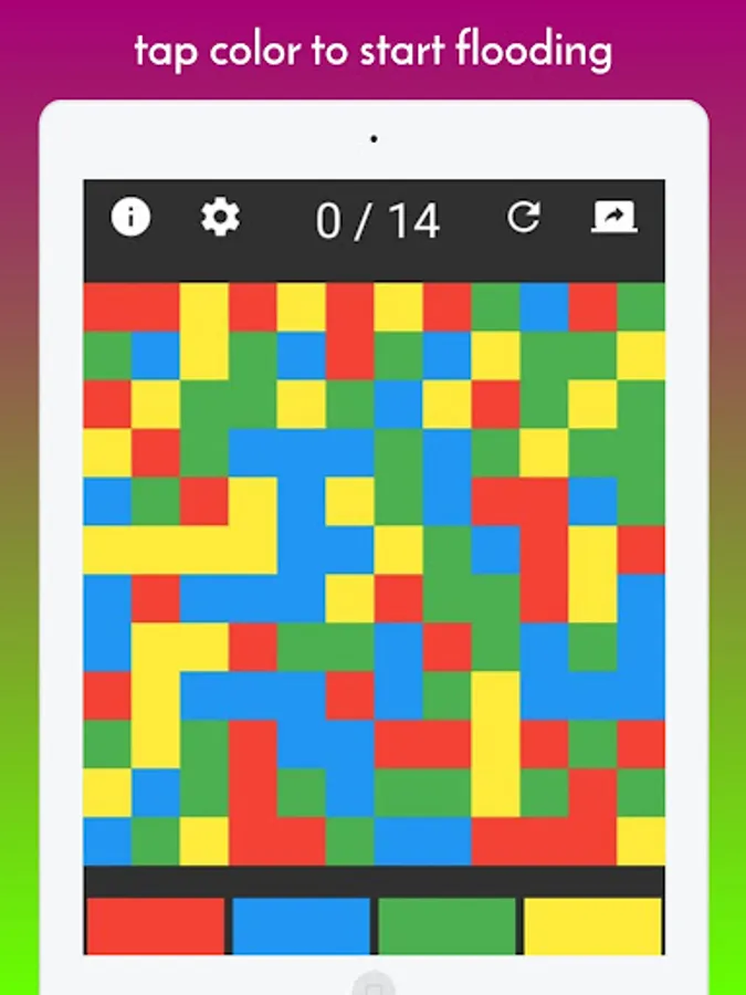 You need to start flooding color with top left pixel. Select any of 6 colors to start with by simply tapping on color button at the bottom, Fill first pixel and all adjacent pixels of the same color will be painted over with the new color.