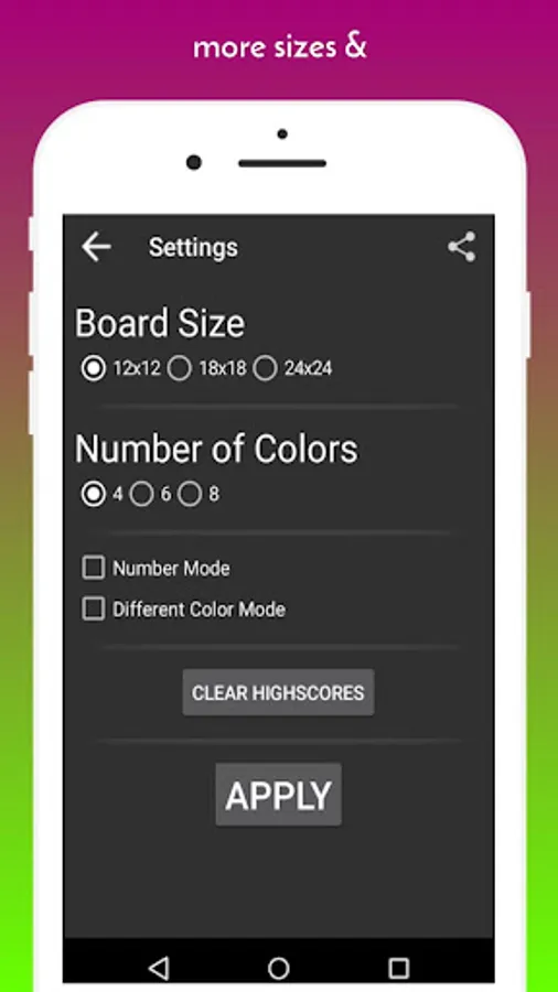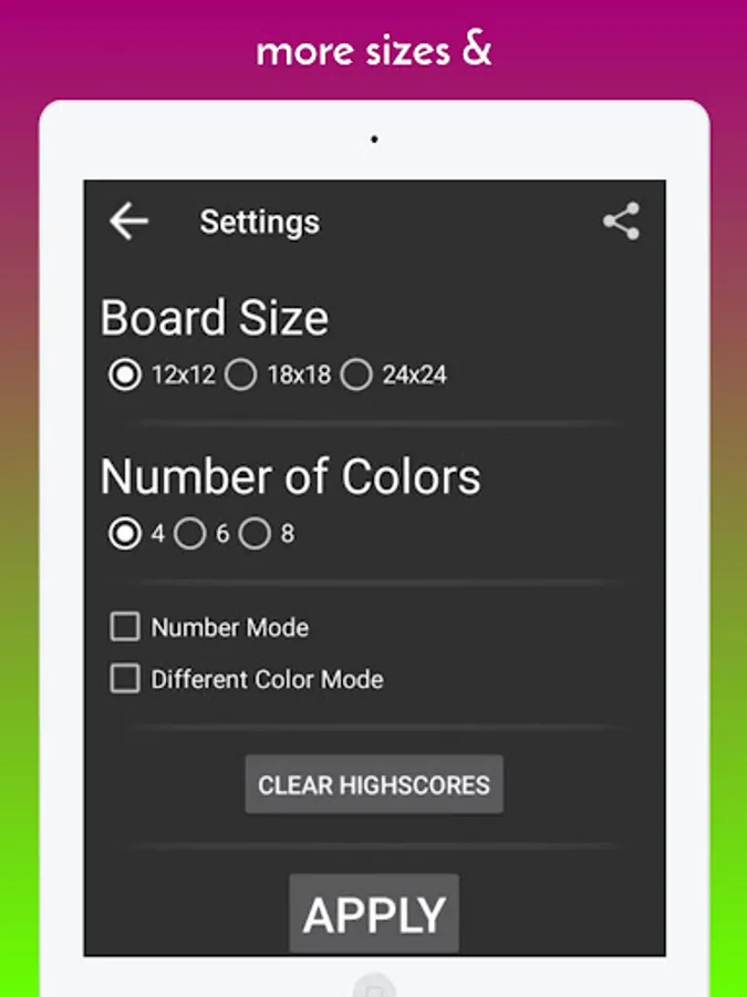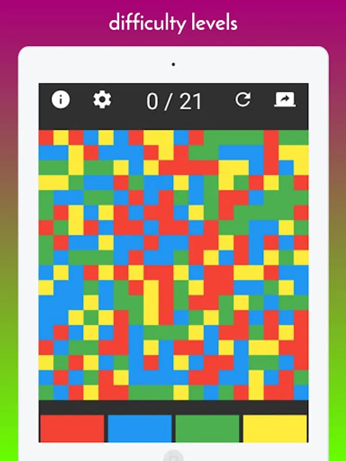 - Difficulty levels with number of colors on board: Easy(4 colors), Medium(6 colors) & Difficult(8 colors)