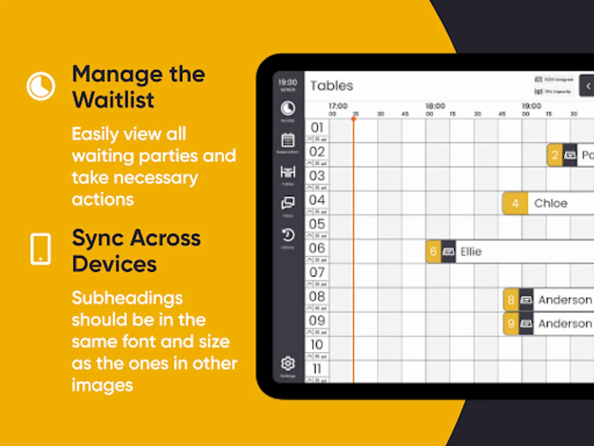 - Bring your whole team on board with multi-device sync. Now everyone views the waitlist and reservation management screen at any time.