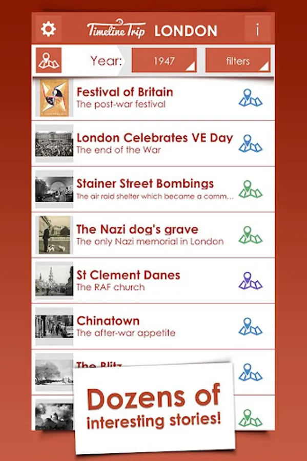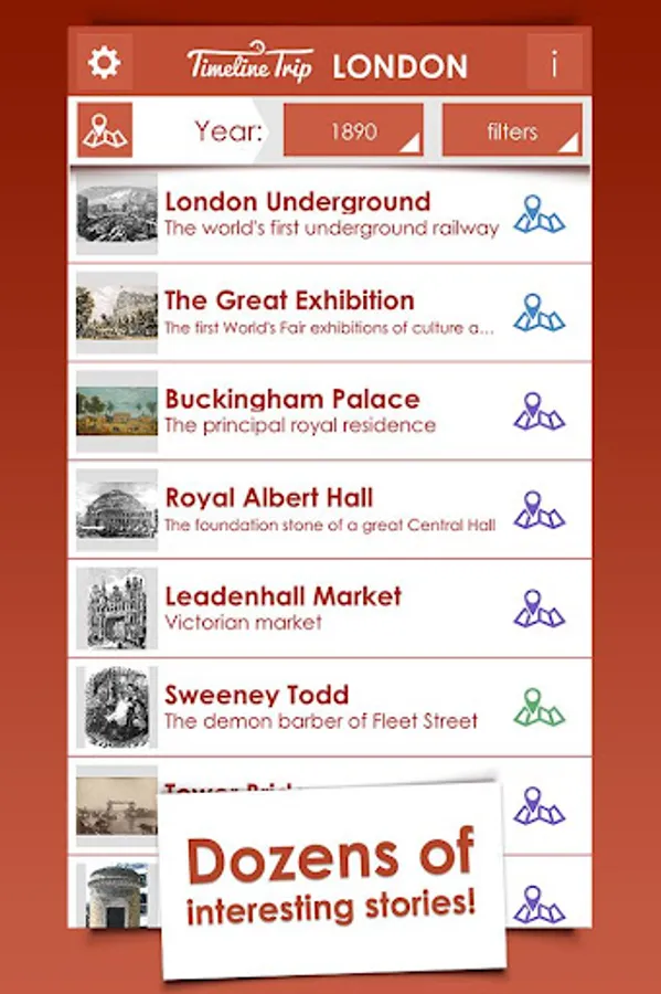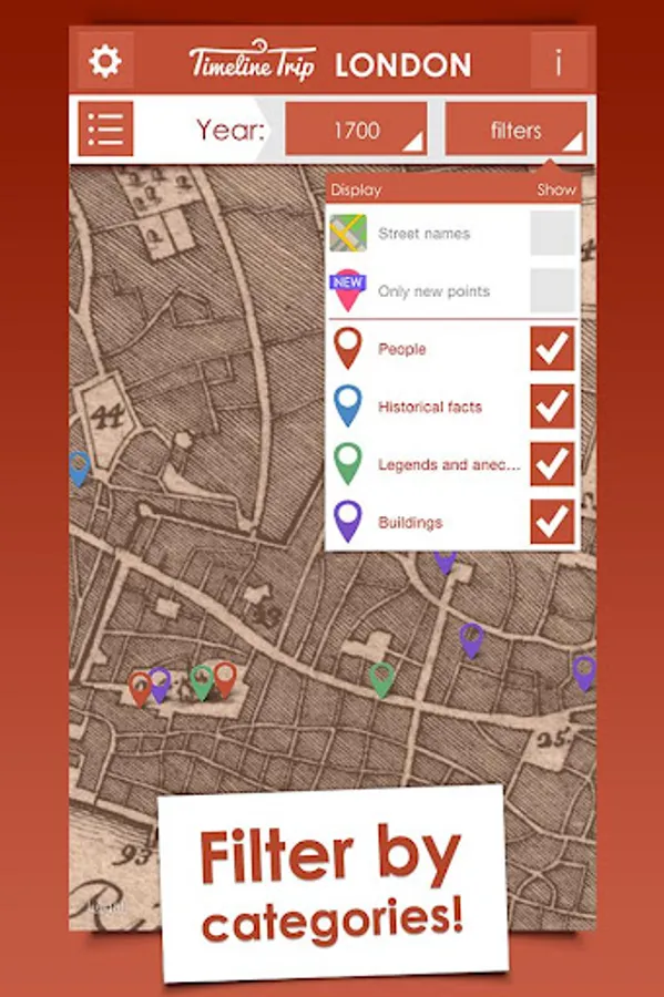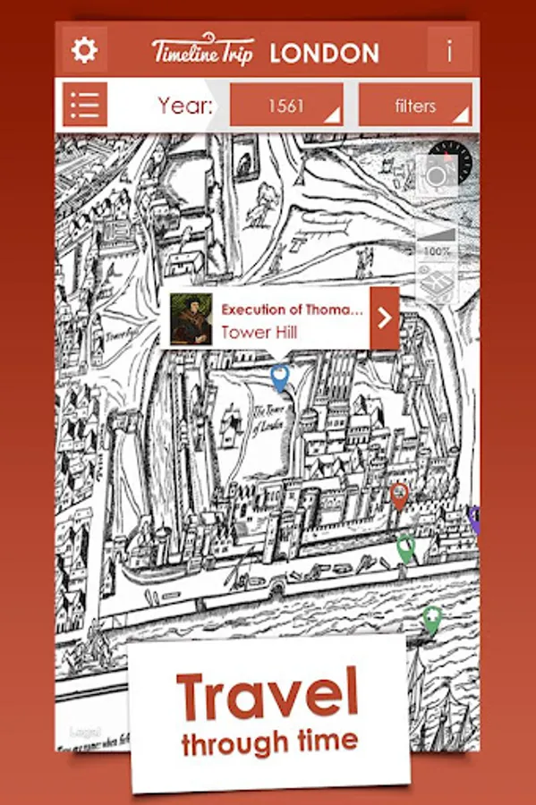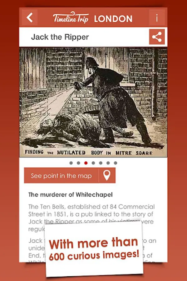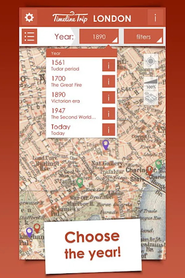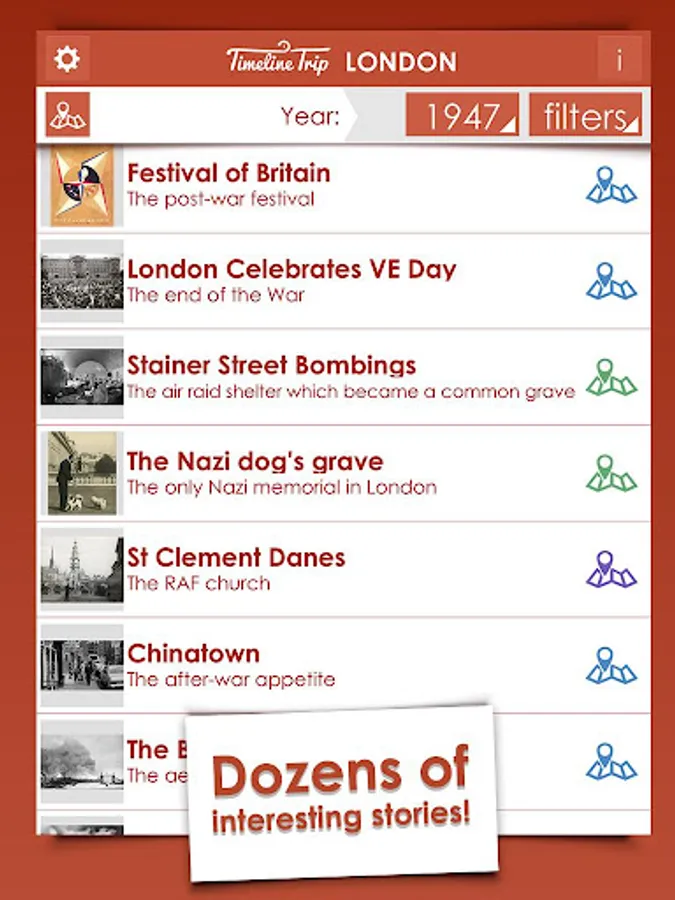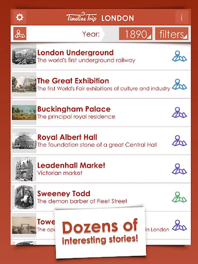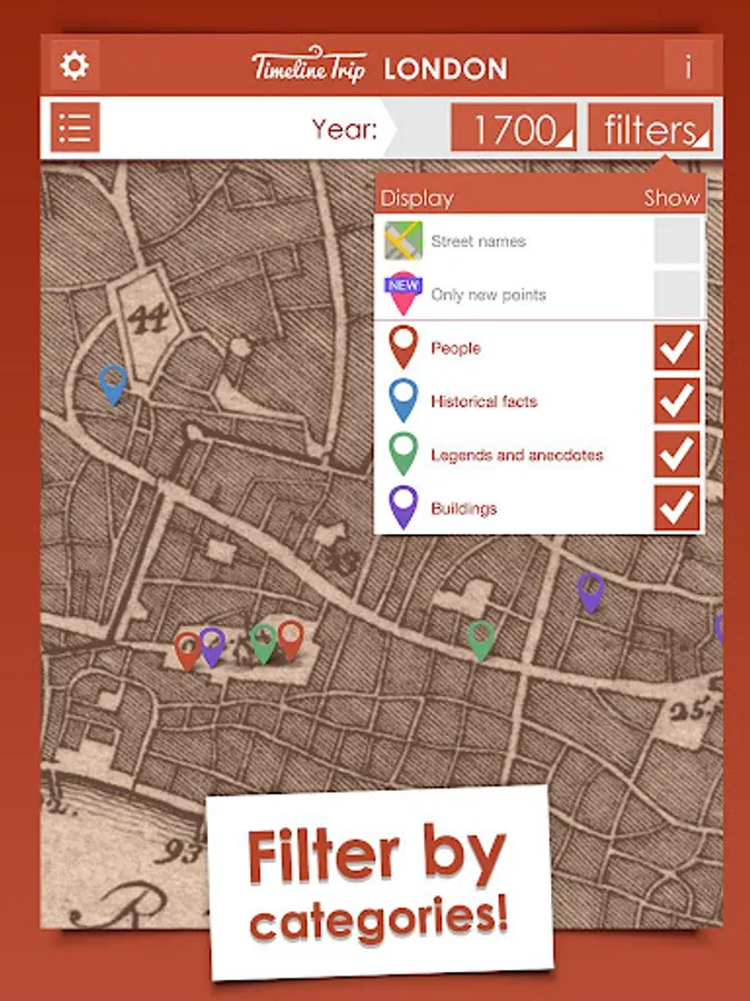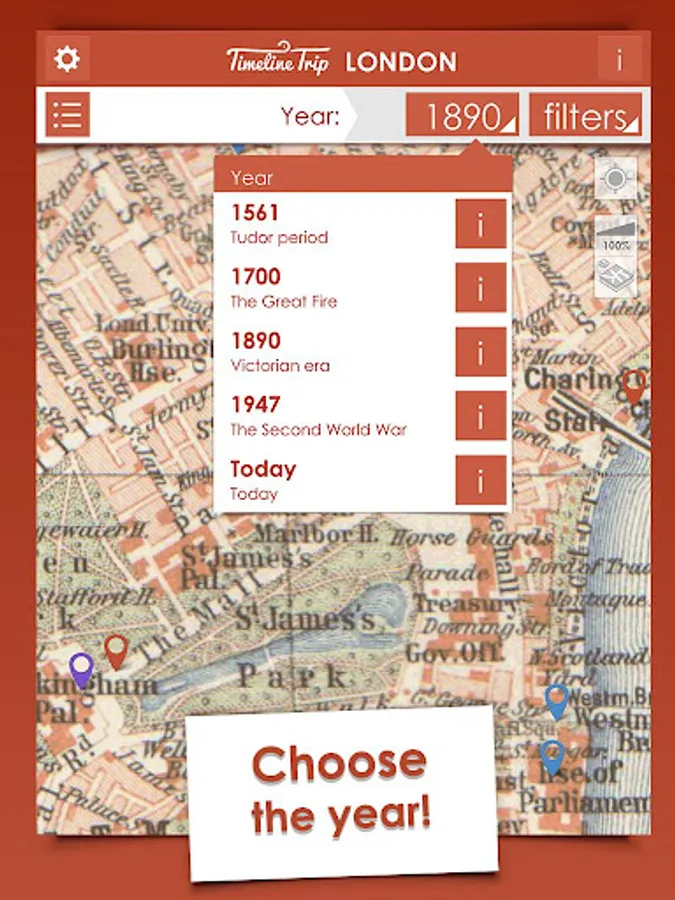 Travel through time and get to know London in a different way. Use GPS and walk the old maps to discover the secrets, legends, characters and stories from different eras of London, The Tudors, the Great Fire, the Victorian Era, World War II or XXI century London. Find out how the city has evolved, where missing buildings were and how others have changed. With more than 600 illustrations of yesterday and today and dozens of interesting stories divided into years and categories about London.