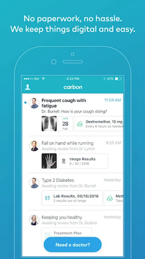 Carbon’s doctors are accessible online through our app and in-person at our clinic, providing a seamless and easy experience that works with our busy lives. Our integration with pharmacies, labs, insurance providers, specialists and more allows you to manage your healthcare from one simple app.