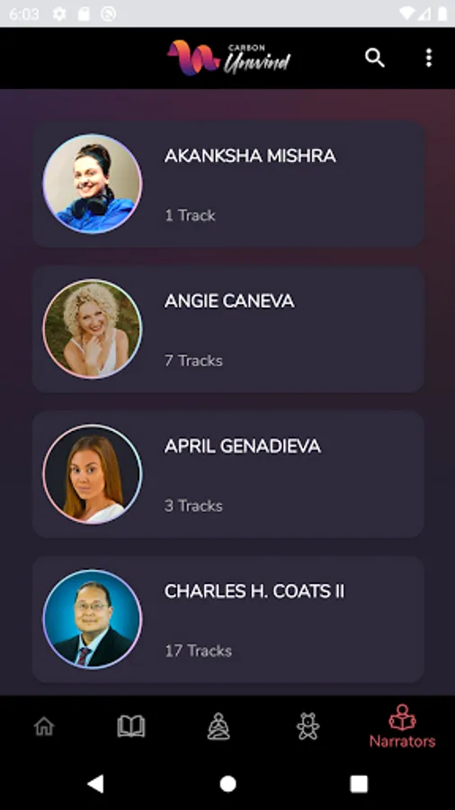- Choose content based on narrator list, categories, or search option