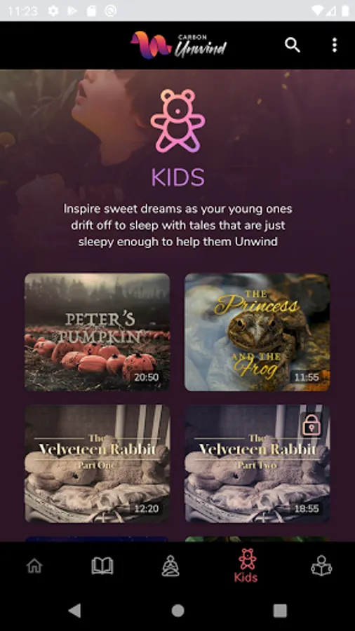 - Kids section featuring a wide range of bedtime stories to help children sleep more peacefully