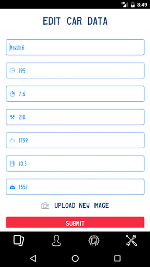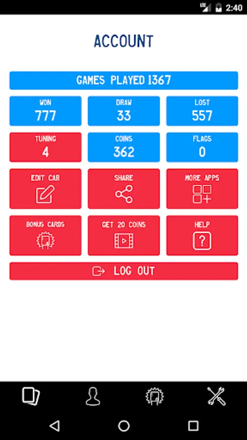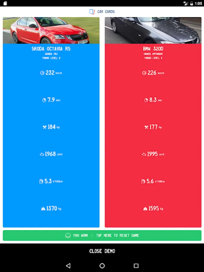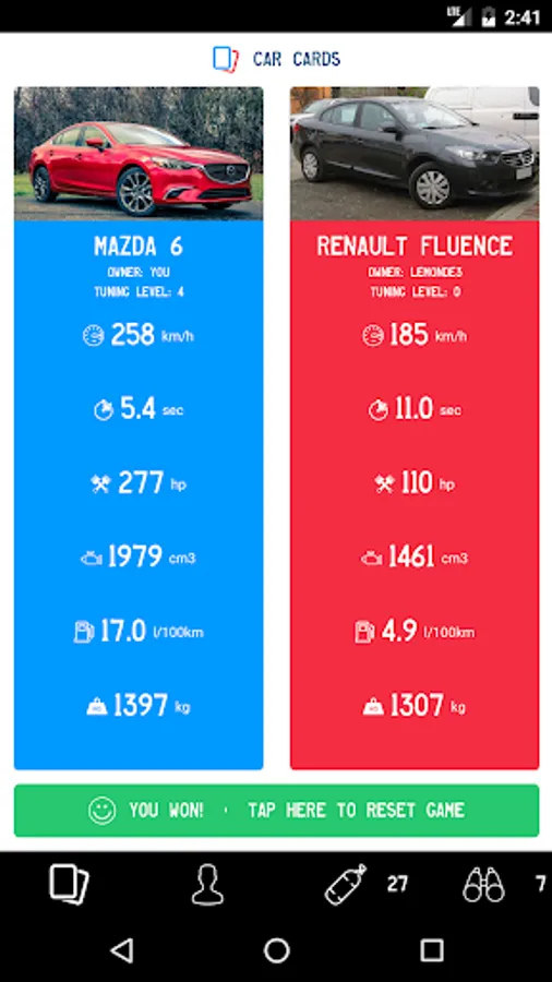 Create an account (only username and password are required), fill out your car data (if you don’t know all of them there are a bunch of portals which provide detailed car data) and upload a picture of your car either from the gallery or take a new one. As soon as you are done you will see the main screen which is basically the game. You will find your car in the left with blue background and all your car data. Pick one to start a new game. You will play against another real user. If you win you get a coin, which will be good later to tune your car or buy bonus cards.
