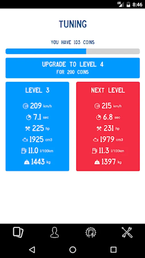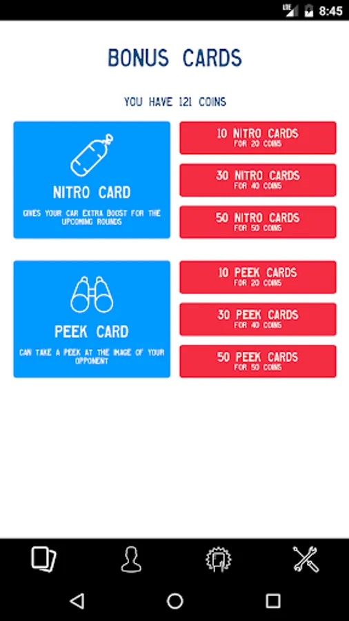 If your car is not good enough you can buy tuning or bonus cards for some coins. Bonus cards include nitro (gives you an extra boost for some rounds) and peek cards (you can take a peek at your opponent’s car picture, which makes your decision easier).