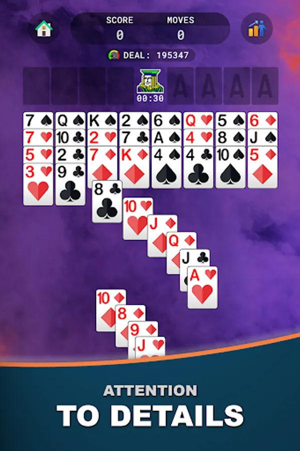 This FreeCell Solitaire game follows the original hard rules made popular in the 90s. With 1000000 numbered deals, each one is winnable if you play with skill. Use the free cells wisely, build the four foundation piles in order, and complete your winning streak to track progress and level up.