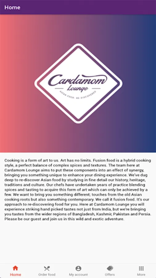 We want to bring you something different; touches from the old Asian cooking roots but also something contemporary. We call it fusion food. It’s our approach to re-discovering food for you. Here at Cardamom Lounge you will experience striking hand picked tastes not just from India, but we’re bringing you tastes from the wider regions of Bangladesh, Kashmir, Pakistan and Persia. Please be our guest and join us in this wild and exotic adventure.