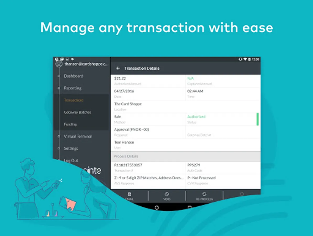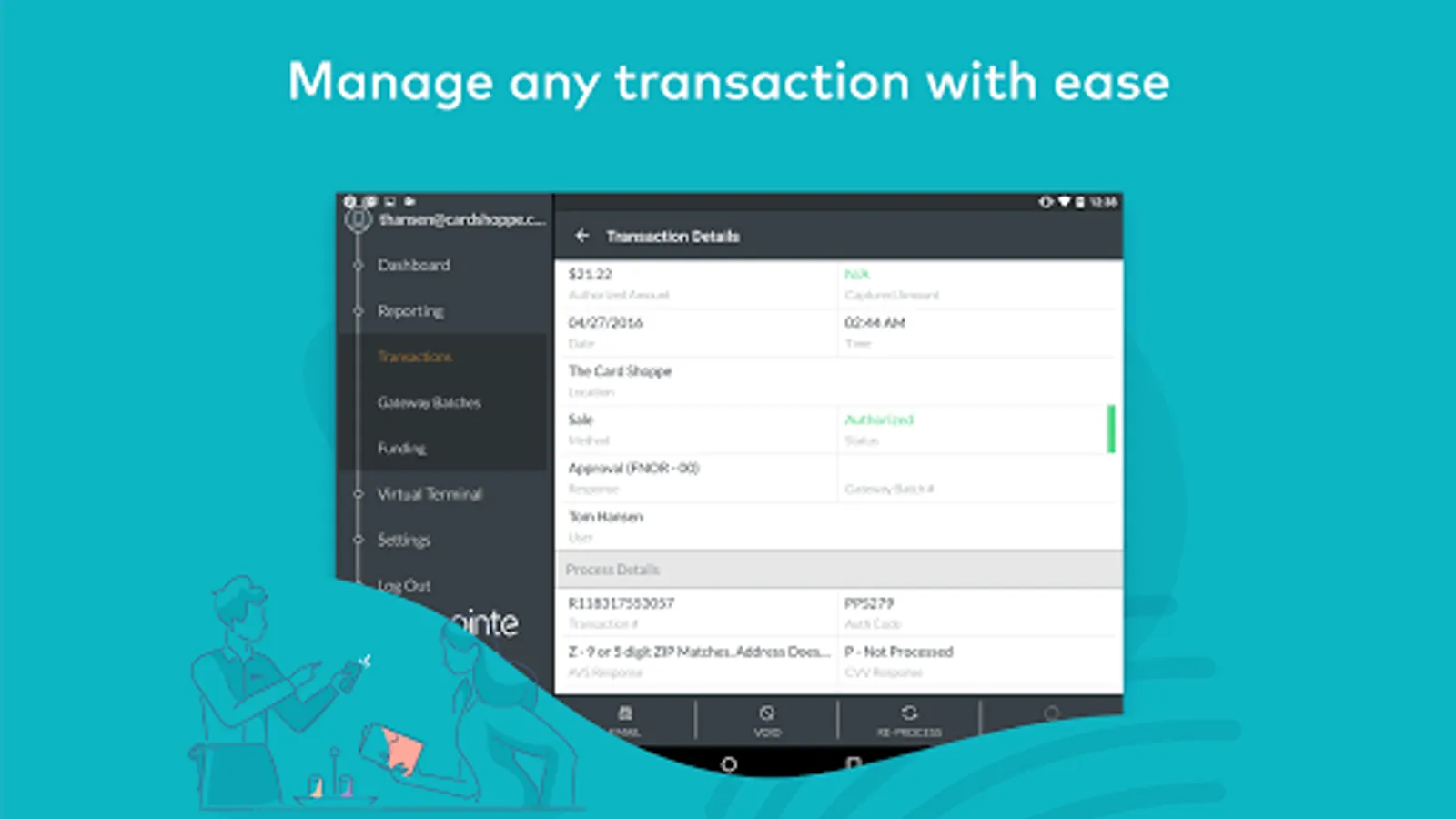 • Transaction Management: Void, refund, reprocess, or resend receipts for existing transactions.