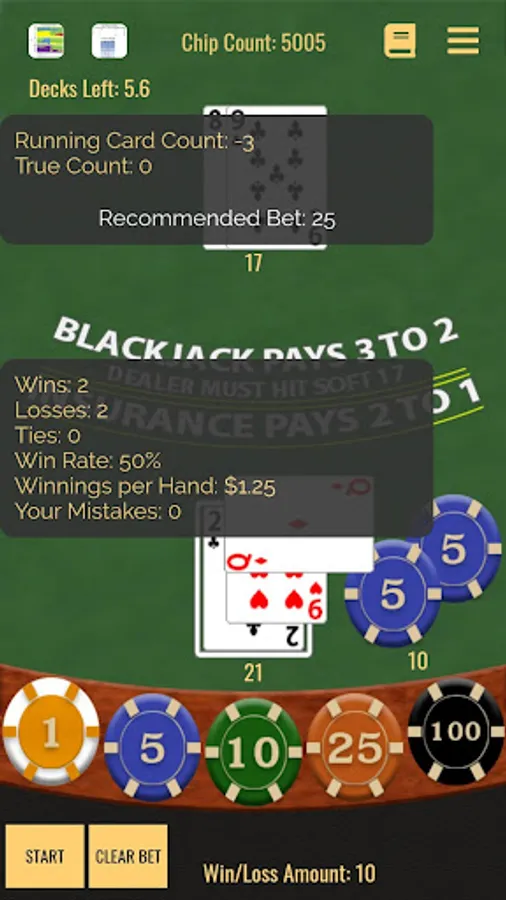 This Blackjack (a.k.a. 21) game allows you to practice card counting, as well as mastering basic strategy. It is an intuitive teaching aid to help beginners and experts alike.