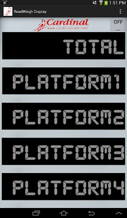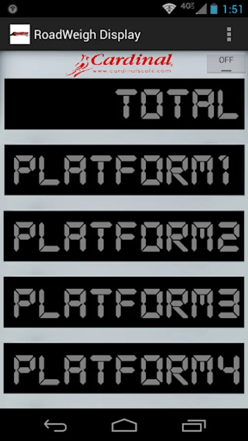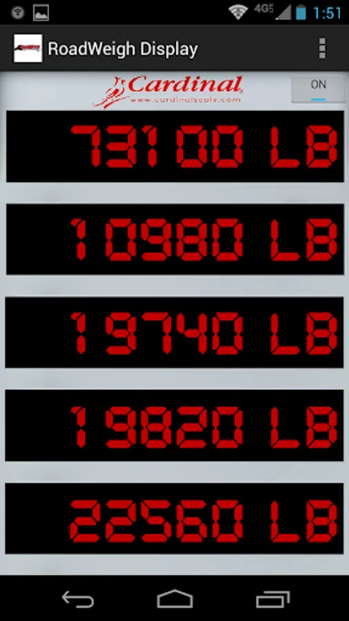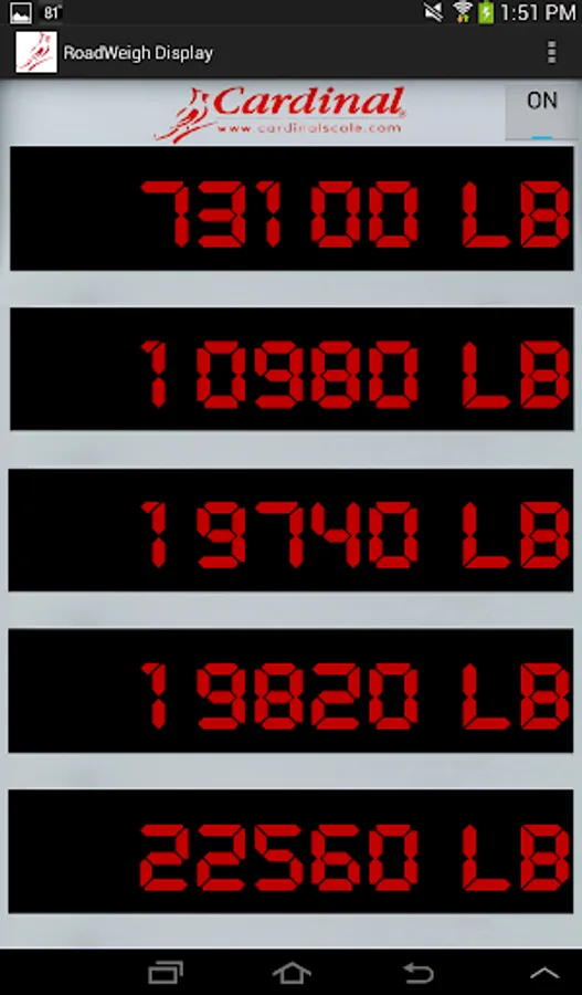 RoadWeigh Display allows you to hold five Cardinal SB500/SB250 remote displays in the palm of your hand. Allows you to walk around the truck while it's weighing without ever taking your eyes off of the weight.