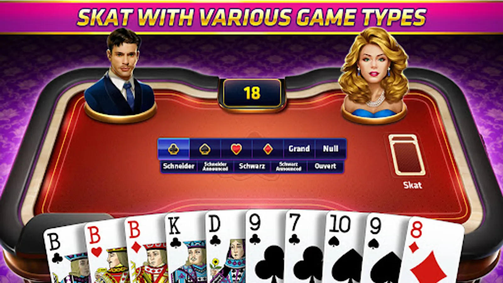 Skat is a traditional German card game with a history of more than 200 years, which is deeply loved by Germans. Now you can play it on your cell phone. It's completely free and there's no need to connect to the Internet. Without the restriction of the Internet, you can play it anytime, anywhere!Come and experience the fun of skat!