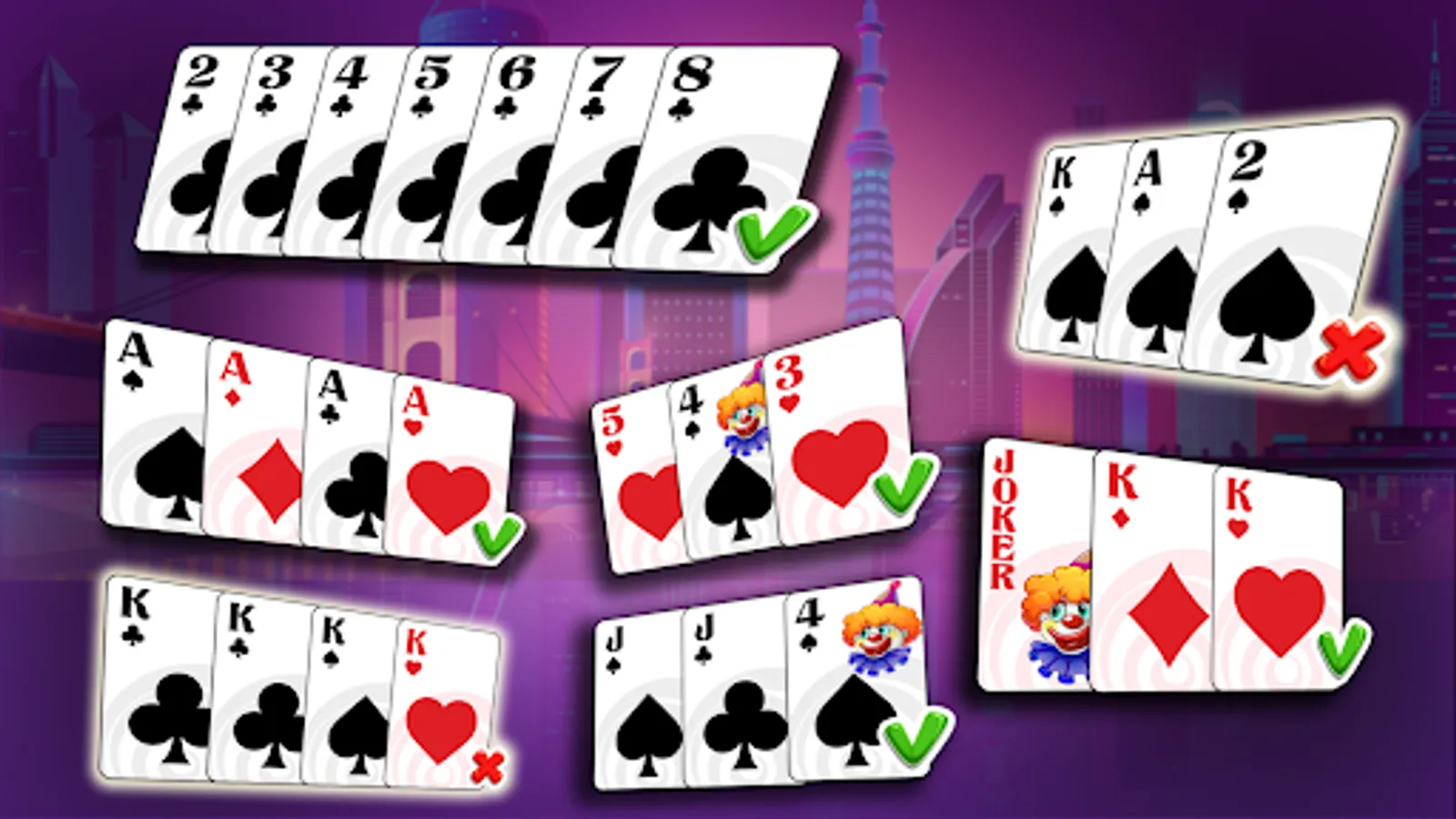 Rummy uses joker cards, and these cards can be used as substitutes for any card to form combinations(which is called a non-pure sequence or set).