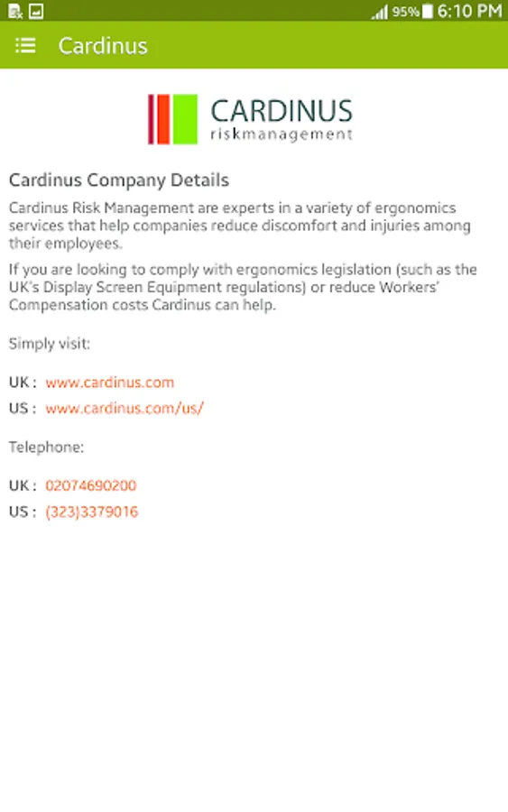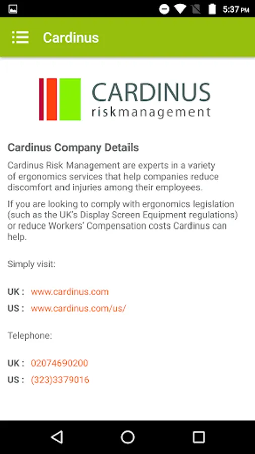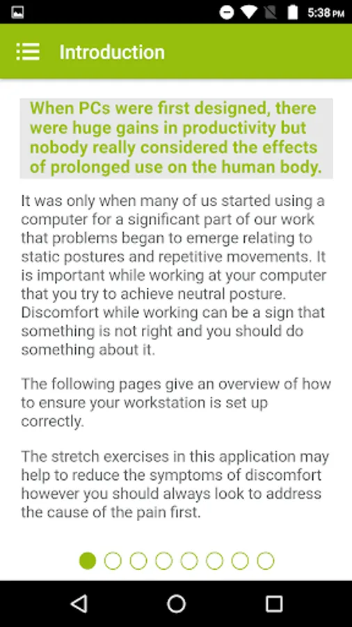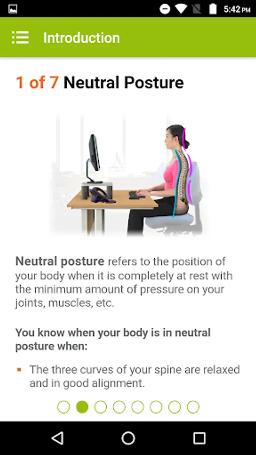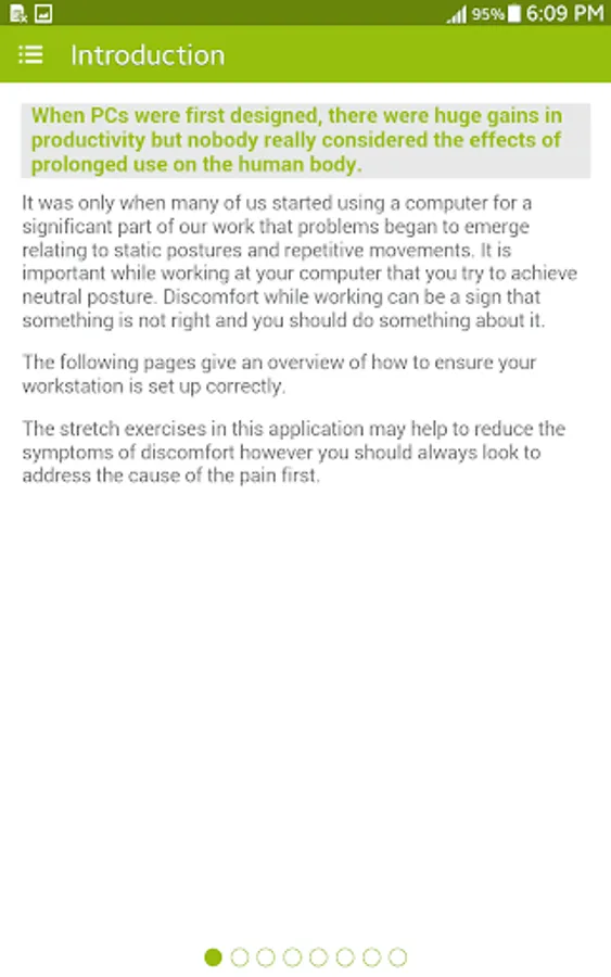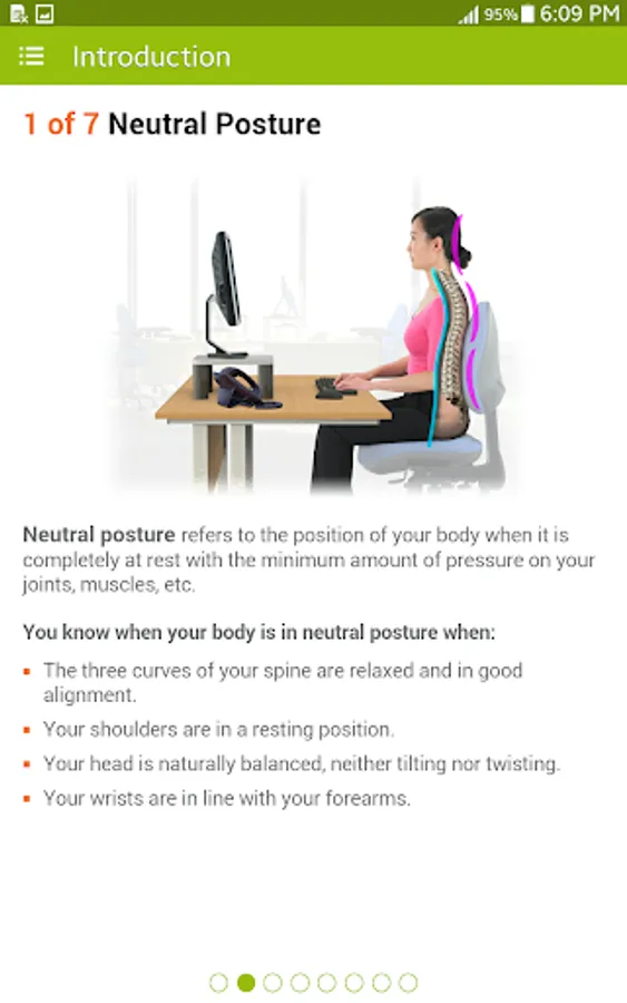 The app also includes some practical tips for setting up your computer and desk so that you can minimize your exposure to bad posture whilst you work which can lead to stiffness, discomfort and fatigue more quickly and can increase levels of discomfort.