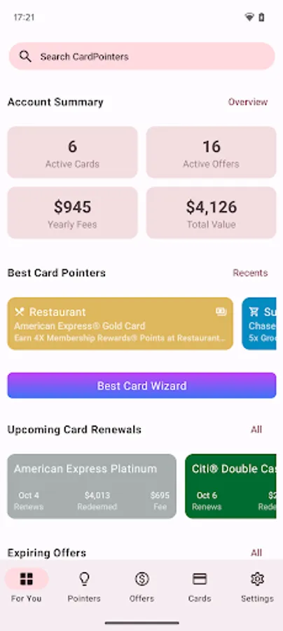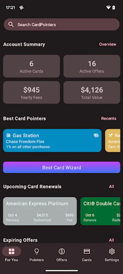 In addition to helping you with the cards you already have, finding even better ones is just as important, and it couldn’t be easier with CardPointers thanks to annual fee tracking, renewal recommendations, and personalized offers based on your existing cards and preferences.