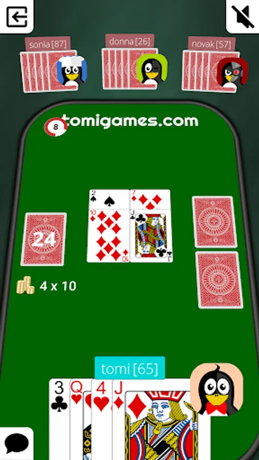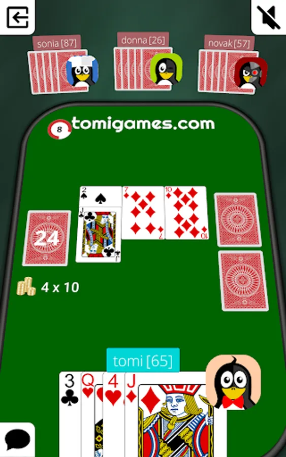 The game is played with a full deck of 52 cards. Every player gets 6 cards, and 4 cards are put open on the table. Every player can use one card from his hand, and match it with in points one or more cards on the table. The value of the cards is: