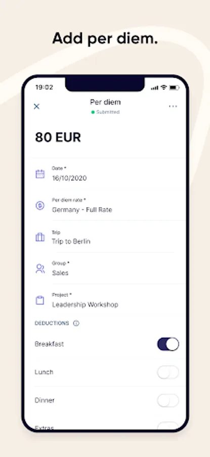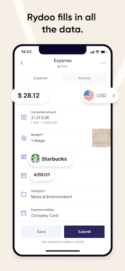 • Save time filling in your expenses. Our system will read and extract data automatically from the receipt.