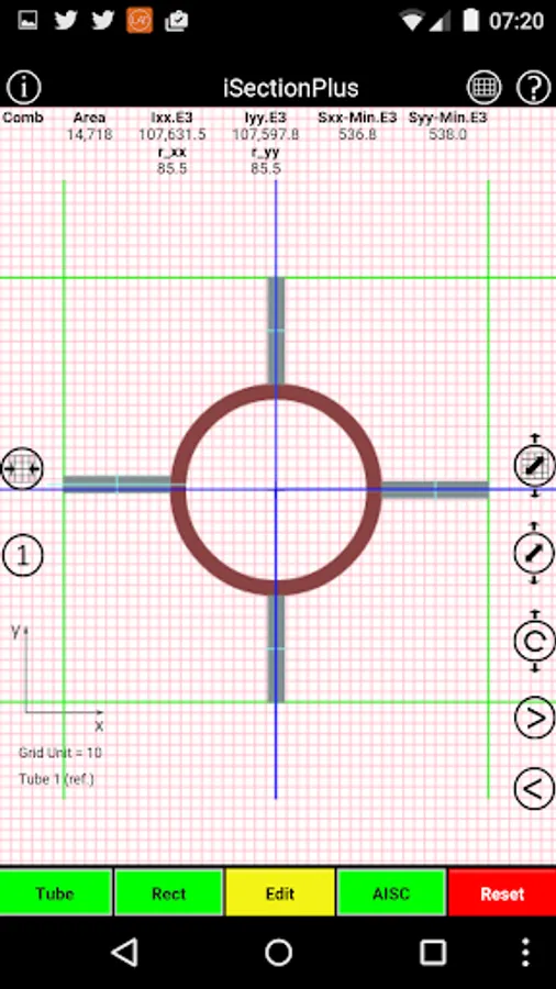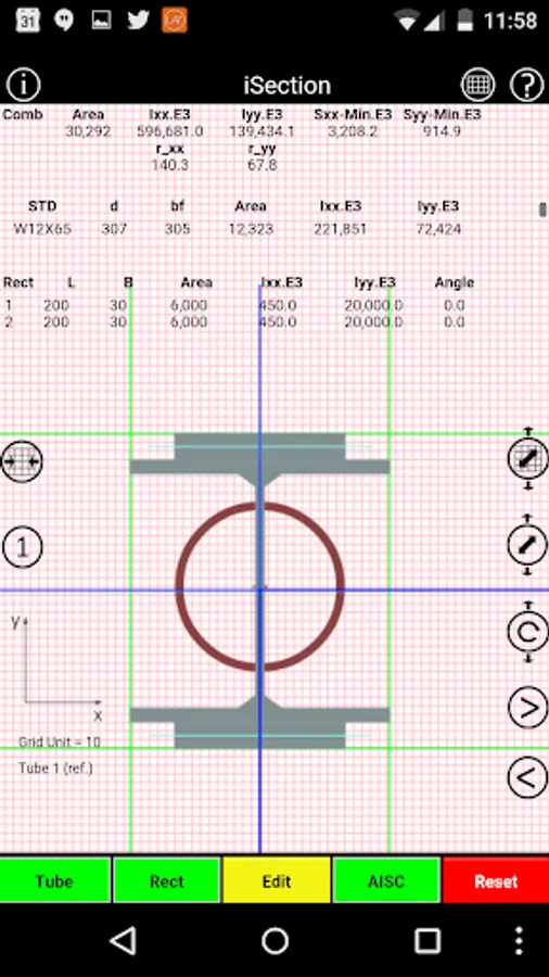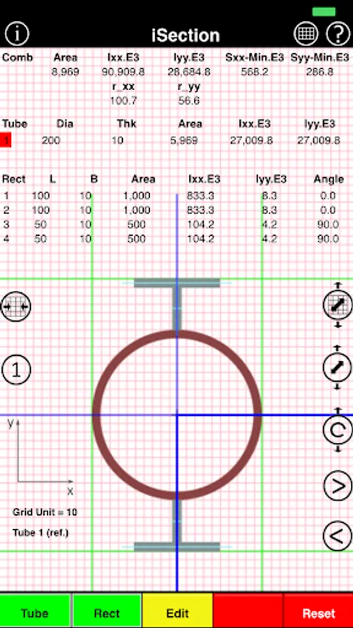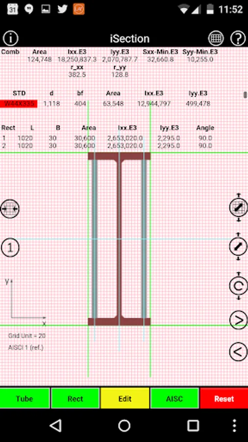 The App calculates the area, second moment area (moment inertia) and moduli of inertia of every component and combination of AISC and EN standard beams, tubes and rectangles. The graphical representation and touch-and-drag interface make locating the components easy.