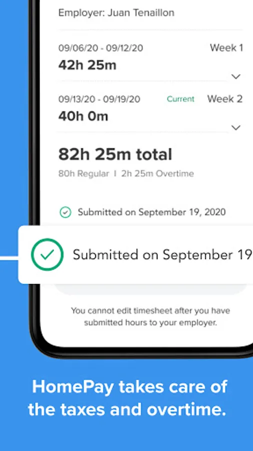 Time tracking has never been easier for nannies and caregivers. Track and submit your regular and overtime hours to your employer for payroll, all in the HomePay app.