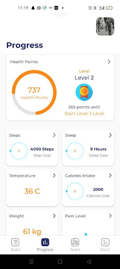- View care plan progress, and watch as you accumulate "health points", leveling up and earning badges