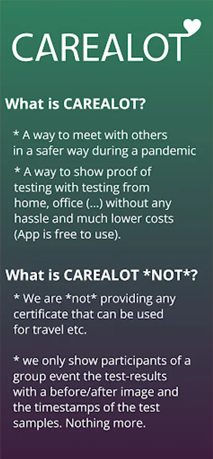 CAREALOT is the App that enables us to meet each other in realtive safety in times of pandemics (like Influenza, the flu, Covid, other transmissible diseases,...)