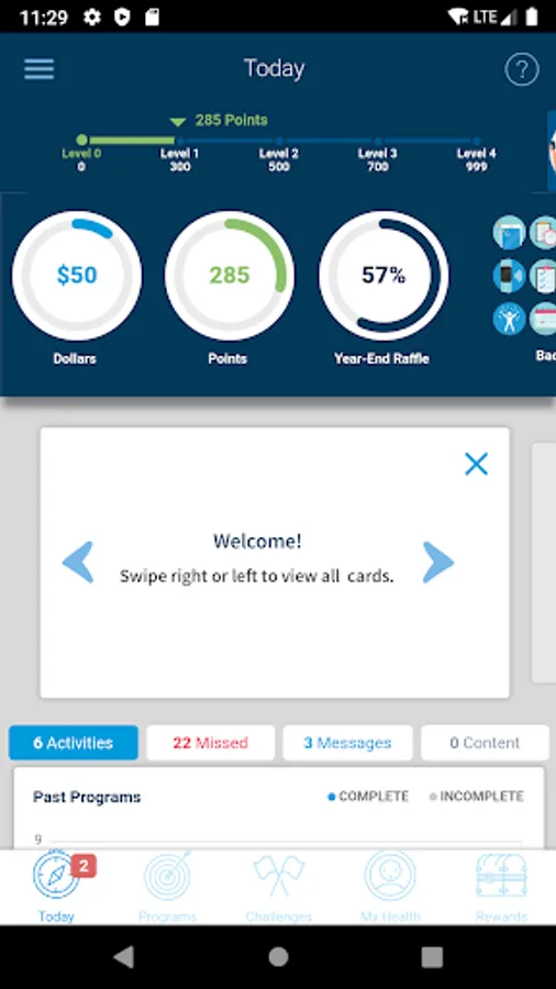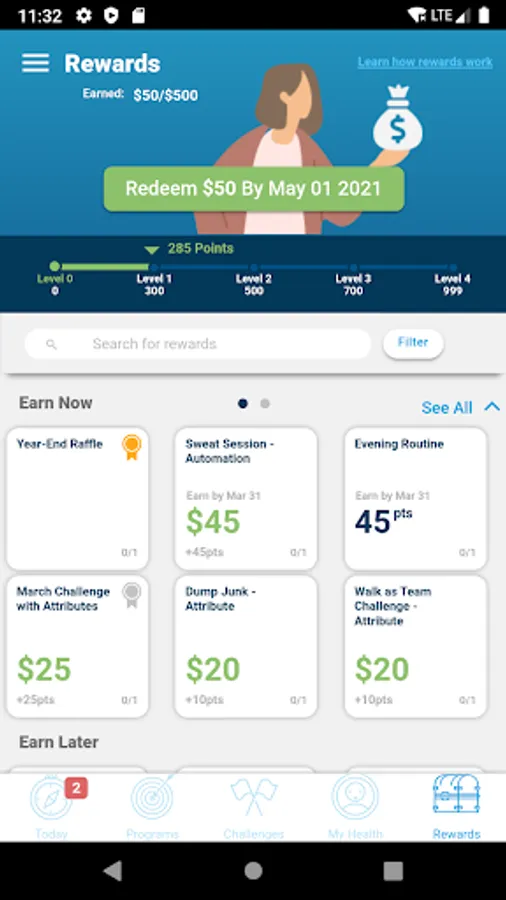 • Commitment to your health and well-being deserves some major acknowledgement and rewards: 1. Earn dollars to redeem for gift cards at your favorite retailers. 2. Earn points by completing activities within the app. The more points you earn, the higher your level. The higher your level, the more dollars you can earn. 3. Earn badges to recognize important milestones you’ve achieved.